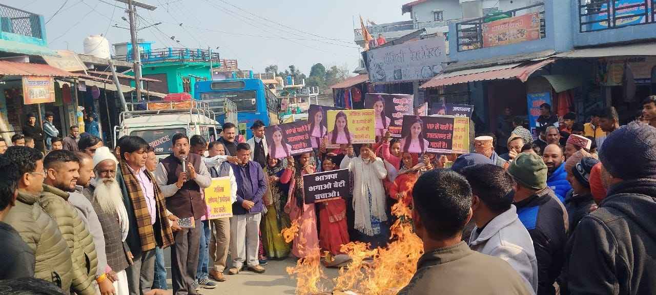 अल्मोड़ा। अंकिता भंडारी हत्याकांड को लेकर शनिवार को लमगड़ा में कांग्रेस कार्यकर्ताओं ने जुलूस निकाला और भाजपा का पुतला दहन किया। प्रदर्शन के दौरान प्रदेश सरकार पर गंभीर आरोप लगाते हुए मामले की निष्पक्ष जांच और पीड़िता को न्याय दिलाने की मांग की गई। इस अवसर पर पूर्व विधानसभा अध्यक्ष गोविन्द सिंह कुंजवाल ने कहा कि उत्तराखंड की बेटी अंकिता भंडारी की निर्मम हत्या ने पूरे प्रदेश को झकझोर कर रख दिया है। यह केवल एक बेटी की हत्या नहीं, बल्कि राज्य में कानून व्यवस्था की भयावह स्थिति का प्रत्यक्ष प्रमाण है। उन्होंने आरोप लगाया कि भाजपा सरकार न्याय दिलाने के बजाय आरोपियों को बचाने में लगी हुई है। इतने गंभीर मामले में अब तक मुख्य साजिशकर्ताओं को संरक्षण मिलना सरकार की मंशा पर बड़ा सवाल खड़ा करता है। उन्होंने यह भी आरोप लगाया कि पूरे प्रकरण में वीआईपी कनेक्शन को बचाने का प्रयास किया गया है। उन्होंने कहा कि प्रदेश की जनता जानना चाहती है कि सरकार आखिर किसे बचा रही है। यदि सरकार में नैतिक साहस है तो इस मामले की निष्पक्ष जांच सीबीआई या उच्चतम न्यायालय की निगरानी में कराई जानी चाहिए। कांग्रेस जिलाध्यक्ष भूपेंद्र सिंह भोज ने कहा कि कांग्रेस पार्टी अंकिता भंडारी को न्याय दिलाने तक चैन से नहीं बैठेगी। उन्होंने स्पष्ट किया कि यह लड़ाई सड़कों से लेकर सदन तक पूरी मजबूती के साथ लड़ी जाएगी। पुतला दहन में पूर्व जिला अध्यक्ष कांग्रेस कमेटी अल्मोड़ा पीतांबर पांडे, ब्लॉक अध्यक्ष लमगड़ा मनोज रावत, महेंद्र सिंह मेर, क्षेत्र पंचायत सदस्य दीवान सिंह सतवाल, देवेंद्र सिंह बिष्ट, पूरन बिष्ट, रजनी फर्त्याल, दीप सिंह डांगी, गोपाल सिंह चौहान, हेम कुमार आर्या, पूरन पाण्डे, राजेंद्र सिंह बेलवाल, त्रिलोक सिंह, रमेश बिष्ट आदि सहित बड़ी संख्या में कांग्रेस कार्यकर्ता उपस्थित रहे।