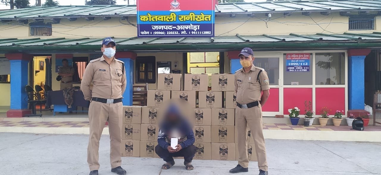 अल्मोड़ा। पंकज भट्ट वरिष्ठ पुलिस अधीक्षक अल्मोड़ा के निर्देशानुसार जनपद में अवैध शराब की बिक्री, तस्करी एवं भण्डारण की रोकथाम में कार्यवाही किये जाने के क्रम में दिनांक 2 अप्रैल को रानीखेत पुलिस एवं एसओजी की संयुक्त टीम ने एसएन श्रीवास्तव अस्पताल को जाने वाले रास्ते पर नूतन बार के नीचे की तरफ बने टिन शेड में 25 पेटी अवैध मैक्डोवेल्स व्हिस्की अंग्रेजी शराब (कीमत एक लाख 68 हजार) के अवैध भंडारण के साथ विकास (24 वर्ष) पुत्र कैलाश चंद्र निवासी ग्राम गेरड़ पो0 ताड़ीखेत जनपद- अल्मोड़ा को गिरफ्तार कर आवश्यक वैधानिक कार्यवाही करते हुए कोतवाली रानीखेत में आबकारी अधिनियम में अभियोग पंजीकृत किया गया।