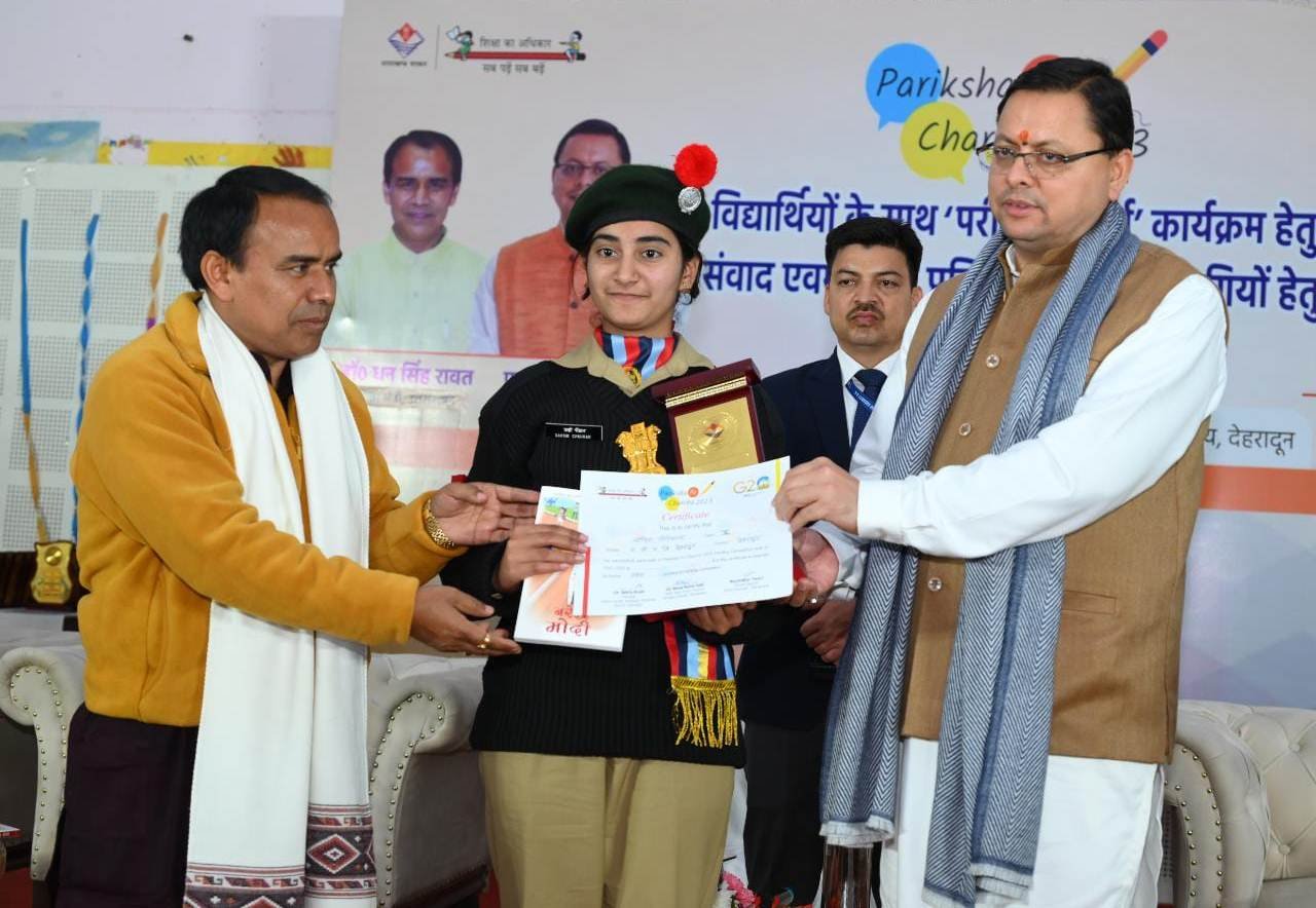 संवाद के दौरान छात्रा कु. शैलजा कुकरेती, छात्रा कु. खुशी, पूजा, निशा गुप्ता रानी, छात्र रामकरण, युवराज आदि द्वारा परीक्षा की तैयारियों एवं मुख्यमंत्री से बचपन में परीक्षाओं की तैयारी से संबंधित प्रश्नों के उत्तर में मुख्यमंत्री ने कहा कि परीक्षा के समय कुछ तनाव सभी को रहता है किंतु पहले के और अबके समय में बड़ा अंतर है। आज पूरी दुनिया आपके मोबाइल में सिमटी है। पहले संसाधनों का अभाव था, उनकी प्राइमरी शिक्षा स्लेट, दफ्ती, दवात और टाट पट्टी में बैठकर हुई। 3-4 कि.मी. पैदल चलकर स्कूल जाना पड़ता था। उन्होंने छात्रों से कहा कि वे अपनी सोच सकारात्मक रखें, आप जैसा बनना चाहेंगे वही बनेंगे। आज हमारे साथ हमारे अभिभावक के रूप में प्रधानमंत्री मोदी जैसा व्यक्तित्व है जो परीक्षा के समय छात्रों से चर्चा कर उनका मार्ग दर्शन कर रहे हैं।