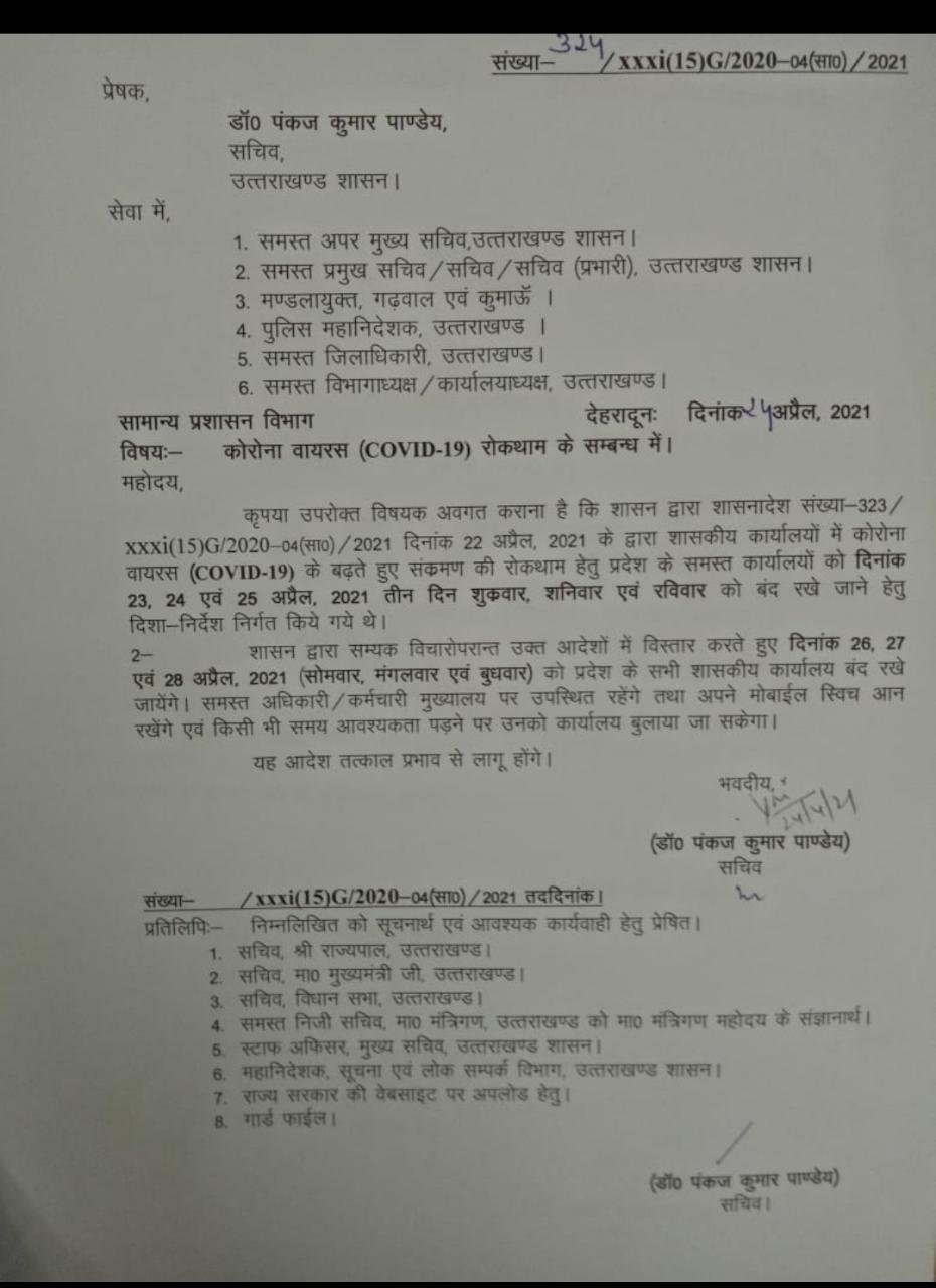 देहरादून। राज्य में सभी सरकारी कार्यालय सोमवार, मंगलवार और बुधवार को भी बंद रहेंगे। कोरोना संक्रमण में लगातार हो रही वृद्धि को देखते हुए यह निर्णय लिया गया है। सचिव सामान्य प्रशासन डॉ पंकज कुमार पांडेय की ओर से शनिवार को जारी आदेश में कहा गया है कि राज्य के सभी सरकारी कार्यालय अब 28 अप्रैल तक बंद रहेंगे। इस दौरान सभी अधिकारी व कर्मचारी मुख्यालय नहीं छोड़ेंगे और जरूरी होने पर उन्हें ऑफिस भी बुलाया जा सकता है। विदित है कि सरकार ने राज्य में बढ़ते कोरोना संक्रमण को देखते हुए पूर्व में 23, 24 और 25 अप्रैल को तीन दिनों तक सरकारी कार्यालय बंद रखने का निर्णय लिया था। जिसे अब बुधवार तक बढ़ा दिया गया है। सचिव की ओर से जारी आदेश में सभी अधिकारियों एवं कर्मचारियों को फोन स्विच ऑन रखने के भी निर्देश दिए गए हैं। राज्य के सचिवालय सहित सरकारी कार्यालयों में बड़ी संख्या में कोरोना संक्रमण के मामले सामने आ रहे थे। इस वजह से अब सरकार ने चेन ब्रेक करने के लिए कुछ दिन सरकारी ऑफिस बंद रखने का निर्णय लिया है।