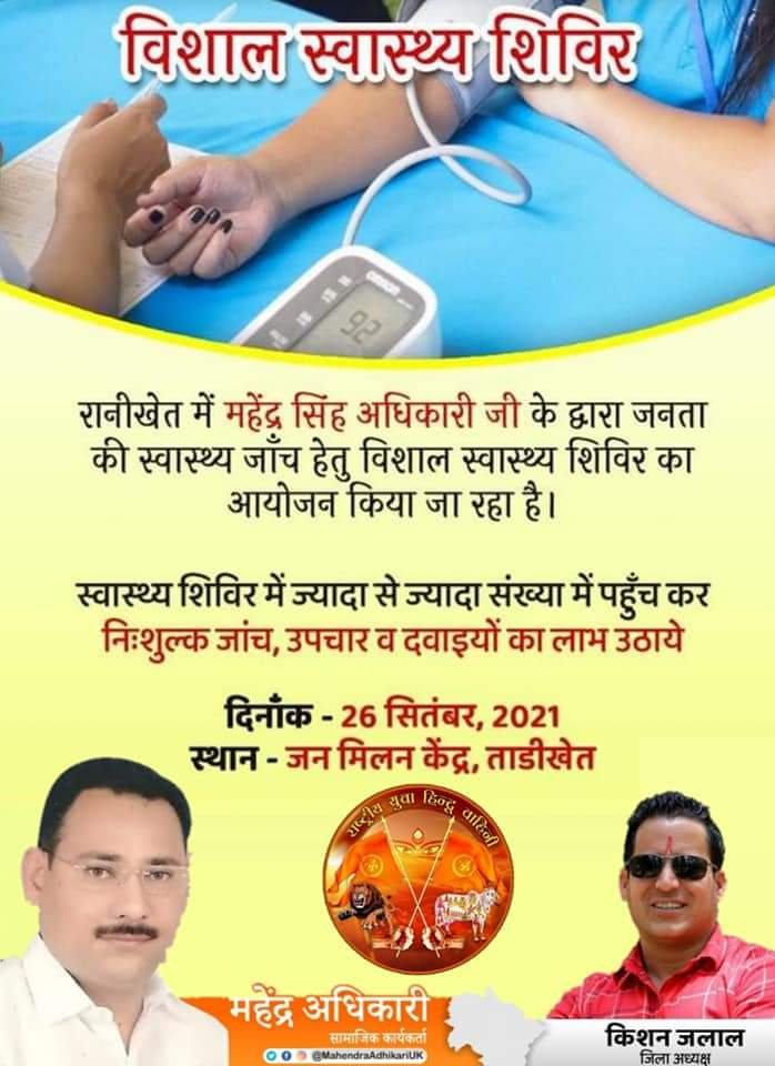 रानीखेत। राष्ट्रीय हिंदू युवा वाहिनी के तत्वाधान में रविवार को जन मिलन केंद्र ताड़ीखेत में वृहद स्वास्थ्य शिविर का आयोजन किया जायेगा। सामाजिक कार्यकर्ता महेंद्र सिंह अधिकारी व राष्ट्रीय हिंदू युवा वाहिनी के जिलाध्यक्ष किशन जलाल ने क्षेत्र की समस्त जनता से वृहद स्वास्थ्य शिविर में अधिक से अधिक संख्या में पहुंच कर लाभ उठाने की अपील की हैं।