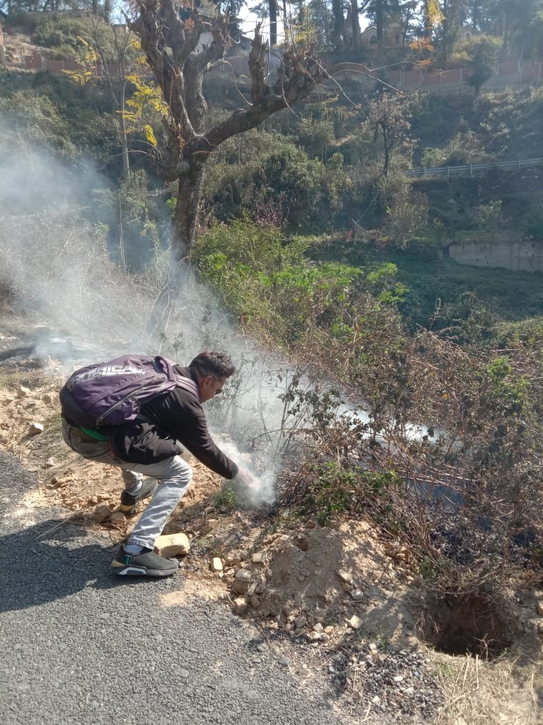 अल्मोड़ा। आज दोपहर 1 बजे कर्नाटकखोला से आगे सड़क के नीचे की ओर जंगल की ओर अचानक आग लग गयी। सड़क के नीचे लगी आग लगातार फैल रही थी। स्थानीय निवासी पूर्व फौजी नरेन्द्र बिष्ट के द्वारा इसकी सूचना लक्ष्मेश्वर वार्ड के सभासद अमित साह मोनू को दी गयी। सभासद ने तुरन्त मौके पर पहुंचकर पूर्व फौजी नरेन्द्र बिष्ट के साथ मिलकर स्वप्रयासों से उक्त आग को बुझाया तथा इसे फैलने से रोका।सभाषद ने जनहित में लोगों से अपील की है कि गर्मी का मौसम प्रारम्भ हो गया है। सूखी घास, जंगल अथवा कूड़े के ढेर में आग ना लगाये क्योंकि आग फैल सकती है जिससे पर्यावरण के साथ साथ ही स्थानीय लोगों के लिए भी दिक्कतें पैदा हो सकती हैं।