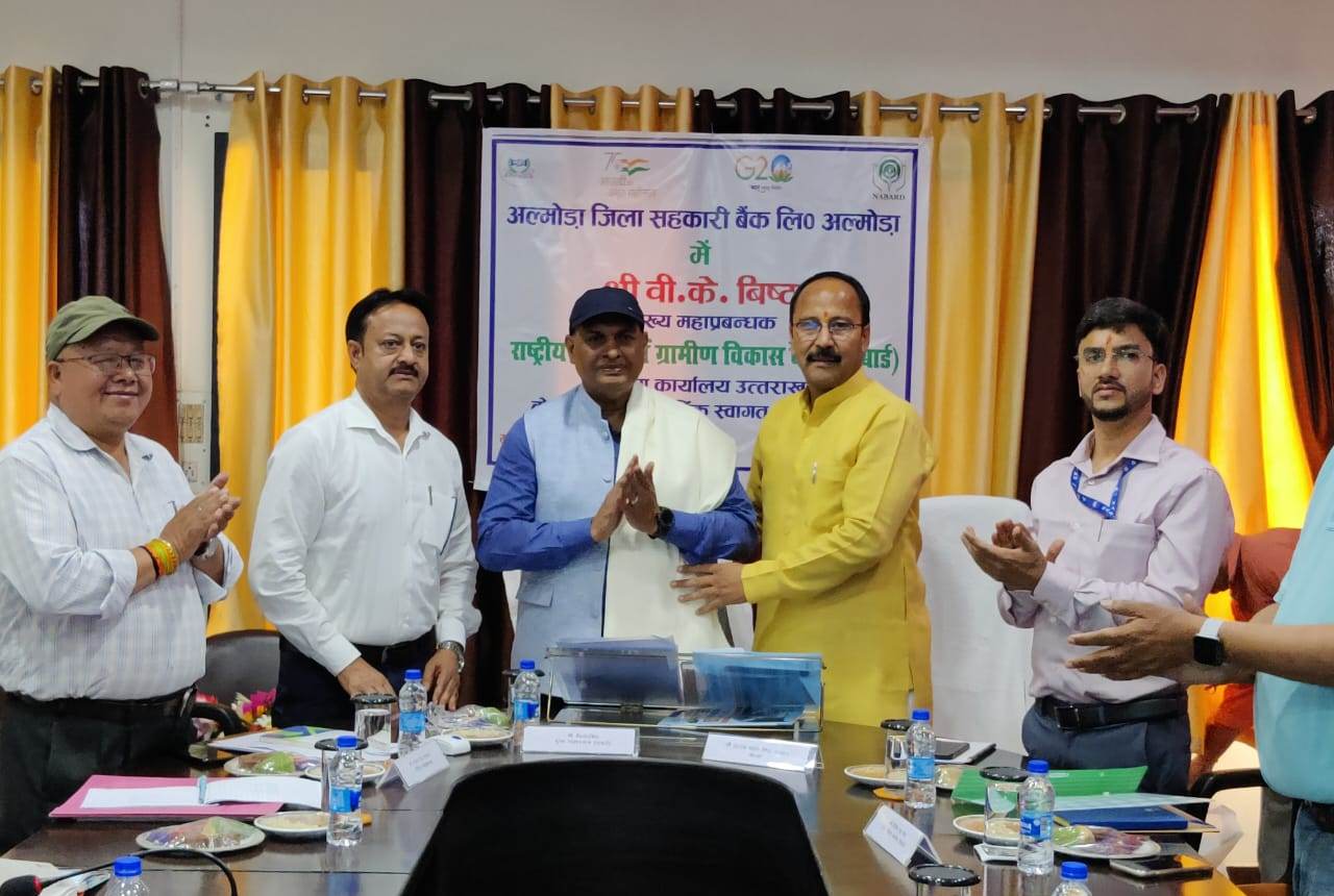 अल्मोड़ा। गुरूवार को अल्मोड़ा जिला सहकारी बैंक मुख्यालय में नाबार्ड, देहरादून के मुख्य महाप्रबन्धक बी के बिष्ट का बैंक के अध्यक्ष ललित लटवाल, सचिव व महाप्रबन्धक एम एस भण्डारी, उपमहाप्रबन्धक जीवन पन्त, डी एस नपलच्याल एवं बैंक के कर्मचारियों के द्वारा स्वागत किया गया। बैंक के अध्यक्ष ललित लटवाल की अध्यक्षता में मुख्य अतिथि मुख्य महाप्रबंधक, नाबार्ड देहरादून एवं बैंक मुख्यालय के अधिकारियों एवं कर्मचारियों के साथ बैठक आयोजित की गई। कार्यक्रम के दौरान बैंक के 05 वर्षों की प्रगति की पुस्तक का विमोचन मुख्य महाप्रबंधक, नाबार्ड द्वारा किया गया। बैंक के सचिव, महाप्रबंधक द्वारा बैंक की योजनाओं एवं प्रगति की जानकारी दी गई तथा मोबाईल बैंकिग एवं नैट बैंकिग / यूपीआई की सुविधा प्रदान करने का अनुरोध किया गया। बैंक अध्यक्ष ललित लटवाल द्वारा भी बैंक प्रगति की जानकारी दी गई एवं मुख्य अतिथि को धन्यवाद दिया गया। बैठक में पीयूष गुणवन्त द्वारा बैंक की प्रगति के 05 वर्षों की प्रगति को पावर पाइंट प्रेजेंटेशन के माध्यम से प्रदर्शित कर बैंक की प्रगति का विवरण रखा गया। बैठक में निक्षेपों में वृद्धि लाने हेतु विशेष अभियान चलाने हेतु निर्देशित किया गया एवं बैंक के निक्षेपों में प्रतिवर्ष कम से कम 15 प्रतिशत की वृद्धि कराने के निर्देश दिए गए। मुख्य महाप्रबंधक नाबार्ड द्वारा अवगत कराया गया कि निक्षेपों का 84 प्रतिशत विनियोजन किया जा रहा है। उक्त में ऋण वितरण को प्रतिवर्ष 20 प्रतिशत बढाने का सुझाव दिया। मुख्य अतिथि द्वारा अवगत कराया गया कि गोदाम एवं मिनी ट्रक हेतु समितियों को 04 प्रतिशत ब्याज दर पर ऋण वितरण करने के निर्देश दिए गए। जिसमें भारत सरकार द्वारा 03 प्रतिशत का ब्याज अनुदान की छूट भी प्रदान की जाएगी। पैक्स सौन्दर्यीकरण हेतु 3.00 लाख तक प्रति पैक्स अनुदान देने एवं पैक्सों को एमपैक्स के रूप में अनिवार्य रूप से 02 समितियों को लाभ प्रदान कराने के निर्देश दिए गए। जनपद में एफपीओ के गठन के निर्देश दिए गए। साथ ही समितियों के इम्बैलेंस को समाप्त करने के निर्देश दिए गए। मुख्य महाप्रबन्धक द्वारा एनपीए 04 प्रतिशत, नैट एनपीए शून्य प्रतिशत, निक्षेप एवं ऋण वितरण की प्रगति पर बैंक की सराहना की गई। जिला प्रबन्धक गिरीश पन्त द्वारा भी बैंक की प्रगति पर सराहना की गई। यहाँ बैठक में भूपेन्द्र बिष्ट, शेखर बिष्ट, राजीव कुमार, श्रीमती लता, श्रीमती निशा, पीयूष गुणवन्त, रामशंकर उपस्थित थे।