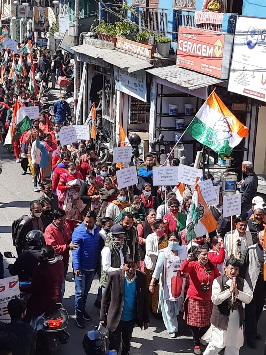 अल्मोड़ा। आज अल्मोड़ा के पूर्व विधायक मनोज तिवारी के नेतृत्व में अल्मोड़ा के कांंग्रेसजनों ने बेतहाशा बढ़ रही महंगाई एवं बेरोजगारी के विरोध में अल्मोड़ा बाजार में विशाल जूलूस निकालकर केन्द्र एवं राज्य की भाजपा सरकार के खिलाफ प्रदर्शन किया। अपने पूर्व घोषित कार्यक्रम के अनुसार कांंग्रेसजन आज दोपहर 12 बजे पूर्व विधायक मनोज तिवारी के नेतृत्व में गांधी पार्क में एकत्रित हुए तथा केन्द्र/राज्य की भाजपा सरकार के खिलाफ जोरदार प्रदर्शन किया। इस अवसर पर पूर्व विधायक मनोज तिवारी ने कहा कि लगातार पेट्रोल, डीजल, रसोई गैस सहित दैनिक उपभोग की प्रत्येक वस्तुओं के दाम बढ़ रहे हैं जिससे जनता त्रस्त है। उन्होंने सत्तासीन भाजपा सरकार पर आरोप लगाते हुए कहा कि सरकार महंगाई पर अंकुश लगाने में पूरी तरह असफल साबित रही है जिसका परिणाम है कि आज पेट्रोल, डीजल और गैस के मूल्य अपनी शीर्ष पर हैं।जिलाध्यक्ष पीताम्बर पान्डेय ने कहा कि लगातार पेट्रोल, डीजल एवं घरेलू गैस की कीमतों में केन्द्र सरकार द्वारा की जा रही बढ़ोत्तरी से स्पष्ट होता है कि यह सरकार गरीब विरोधी है। इस सरकार में युवाओं के लिए रोजगार नहीं है। जूलूस में पूर्व विधायक के साथ सैकड़ों की संख्या में उनके समर्थक तथा कांंग्रेसजन शामिल रहे। प्रदर्शन तथा जुलूस में पूर्व विधायक मनोज तिवारी, जिलाध्यक्ष पीताम्बर पान्डेय, नगर अध्यक्ष पूरन सिंह रौतेला, नगरपालिका अध्यक्ष प्रकाश चन्द्र जोशी,वमहिला जिलाध्यक्ष लता तिवारी, महिला नगर अध्यक्ष गीता मेहरा, यूथ जिलाध्यक्ष निर्मल रावत, वरिष्ठ उपाध्यक्ष तारा चन्द्र जोशी, यूथ कांग्रेस प्रदेश प्रवक्ता वैभव पान्डेय, भूपेन्द्र भोज, हर्ष कनवाल, धीरेन्द्र गैलाकोटी, ब्लाक अध्यक्ष राजेन्द्र बोरा, कार्तिक साह, जिला प्रवक्ता राजीव कर्नाटक, जिला सचिव दीपांशु पाण्डेय, जिला पंचायत सदस्य देवेन्द्र बिष्ट डिम्पल, विनोद वैष्णव, तारू तिवारी, सभाषद सचिन आर्या, सभासद हेम तिवारी, प्रमोद पवार भीमा, पूर्व सभाषद मुकेश नेगी, पूर्व सभासद हेम तिवारी, ललित सतवाल, राबिन मनोज भण्डारी, क्षेत्र पंचायत सदस्य शेखर पान्डेय, जिला उपाध्यक्ष पारितोष जोशी, नगर प्रवक्ता पंकज कान्डपाल, प्रदेश ध्वजवाहक संजय दुर्गापाल, अख्तर हुसैन, फाकिर खान, रोहित रौतेला, प्रीति बिष्ट, राधा बिष्ट, मंजू कान्डपाल, लीला जोशी, दीपा त्रिपाठी, गोपाल चौहान, जगदीश लटवाल, सुन्दर बिष्ट, फहीमुद्दीन,