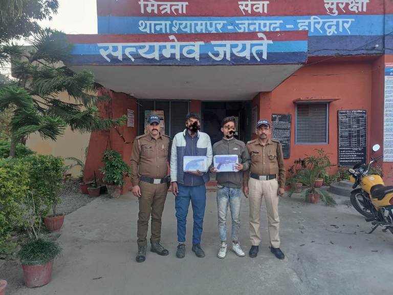 हरिद्वार। थाना श्यामपुर पुलिस ने विवाह समारोह में तमंचे लहराते हुए नाच रहे दो युवकों को गिरफ्तार किया है। थाना श्यामपुर पुलिस के अनुसार क्षेत्र के टांटवाला गांव में शादी में दो युवक तमंचा लहराते हुए डांस कर रहे थे। कुछ लोगों ने इसकी सूचना पुलिस को दी। पुलिस मौके पर पहुंची तो दोनों युवक खेतों के रास्ते फरार हो गए। पूछताछ में पुलिस को पता चला कि तमंचा लहराने वाला एक युवक लवि कुमार पुत्र राजेश गांव का ही रहने वाला है। जबकि दूसरा युवक प्रियांशु सैनी पुत्र बबलू सैनी नगीना बिजनौर का निवासी है। जानकारी के आधार पर कार्रवाई करते हुए पुलिस ने दोनों को गिरफ्तार कर उनके कब्जे से दो देशी तमंचे और दो जिंदा कारतूस बरामद किए। दोनों के खिलाफ सबंधित धाराओं में मुकद्मा दर्ज कर चालान कर दिया गया।
